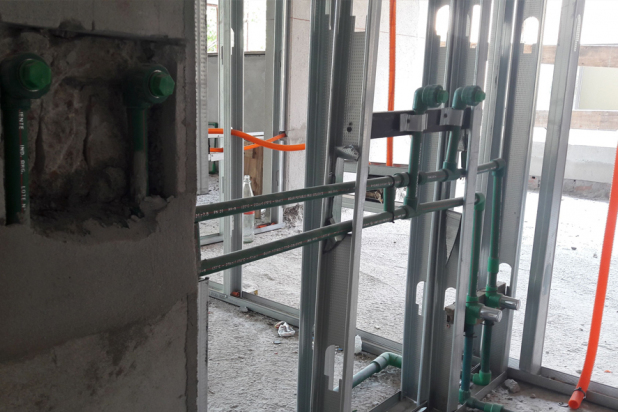 Las instalaciones sanitarias en edificios en altura comprenden la distribución de agua potable a los distintos artefactos y la evacuación de los desechos cloacales y las aguas pluviales. Todas las cañerías y accesorios tanto de abastecimiento como de desagüe son sometidos a pruebas hidráulicas ante la Dirección de Obra, previas al tapado con material.